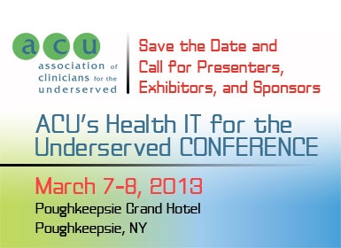 ACU invites interested presenters to submit abstracts for workshops and posters for its first conference on Health IT for the Underserved to be held on March 7-8 at the Poughkeepsie Grand Hotel in Poughkeepsie, NY. Presentations are sought on the use of health IT to improve patient care and outcomes, including: health technology tools, workforce training, patient engagement, team-based technology, patient-centered medical homes (PCMH) and meaningful use (MU), mobile technology, telehealth, and programs for special populations, such as migrant, homeless, or those living in public housing.